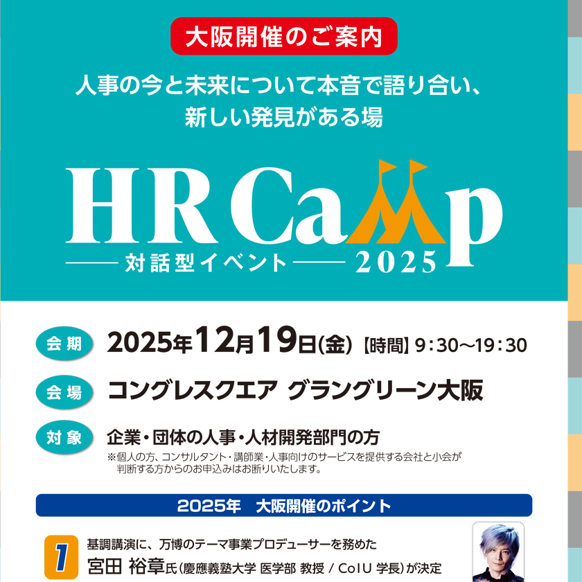 会期 2025年12月19日(金) 9:30~19:30 会場 コングレスクエア グラングリーン大阪 参加対象 企業・団体の人事・人材開発部門の方 ※個人の方、コンサルタント・講師業... -